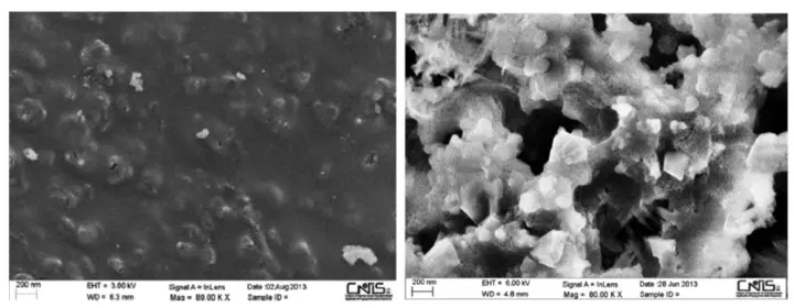 Scanning electron micrographs of titanium oxide (left) and lithium iron phosphate (right).