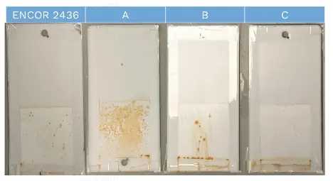 When applied to cold-rolled steel (CRS) panels at a dry film thickness of 50–60 µm, ENCOR® 2436 successfully passed 5 days of continuous salt spray exposure. Notably, this performance was achieved without the use of anti-rust pigments, proving its capability to offer baseline corrosion protection in light-duty to medium-duty environments.