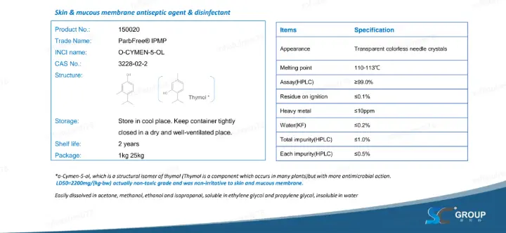 ParbFree® IPMP100 is a complex of o-Cymen-5-ol and Isopentyldiol, where Isopentyldiol acts as a solvent with moisturizing benefits. It works well in water-based systems and is easy to use in microemulsion formulations. Unlike Triclosan—which can release dioxins (carcinogenic when exposed to sunlight)—ParbFree® IPMP comes as a stable, odorless, tasteless white powder with neutral pH and excellent skin safety.